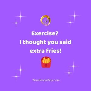 “Exercise? I thought you said extra fries!” WisePeopleSay Scroll, Smile, Repeat Just Smile I wish everything If You Think Nothing Is Impossible My Wallet Is Like an Onion I’m Not Arguing You’re Not Pizza I’m on a seafood diet I’m not lazy I followed my heart Smile while you still have teeth Exercise? Sharing is Caring!